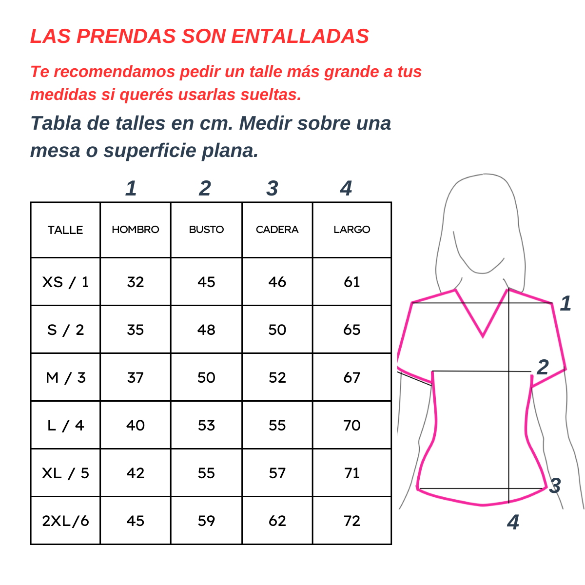 La casaca es entallada, te sugerimos que la medida del busto te dé 1 o 2 cm más grande que tu ambo habitual.
